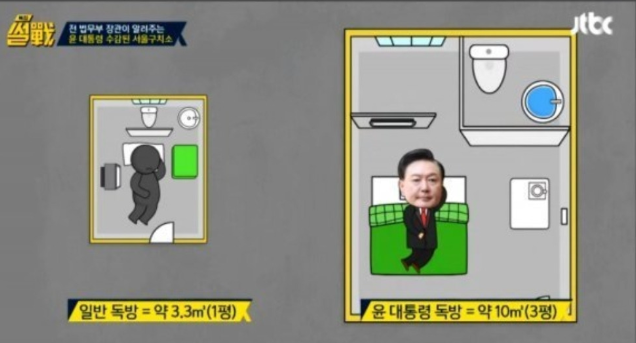 - TV, 접이식 매트리스, 책상 겸 밥상, 관물대, 세면대, 변기, 욕실이 포함된 구주로, 박근혜, 이명박 전 대통령의 독방과 유사한 형태임