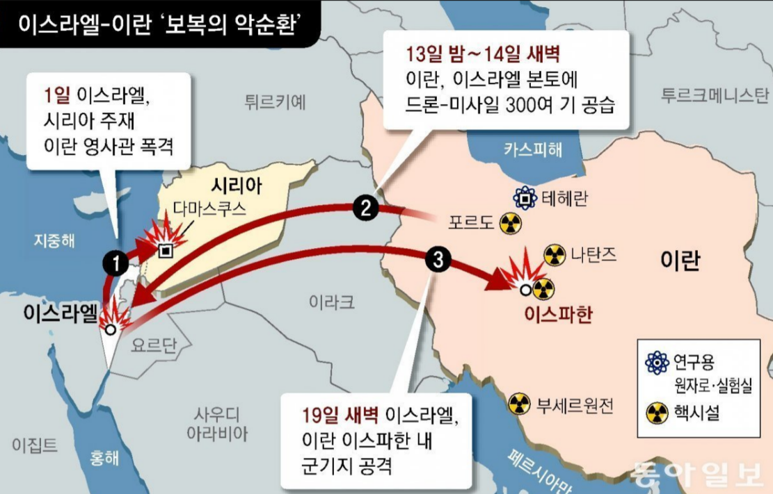 - 이스라엘은 이란이 핵개발을 하지 않는다고 해놓고, 계속 핵개발을 한다는 이유로, 이란에 타격을 가하고 있는 상태.
