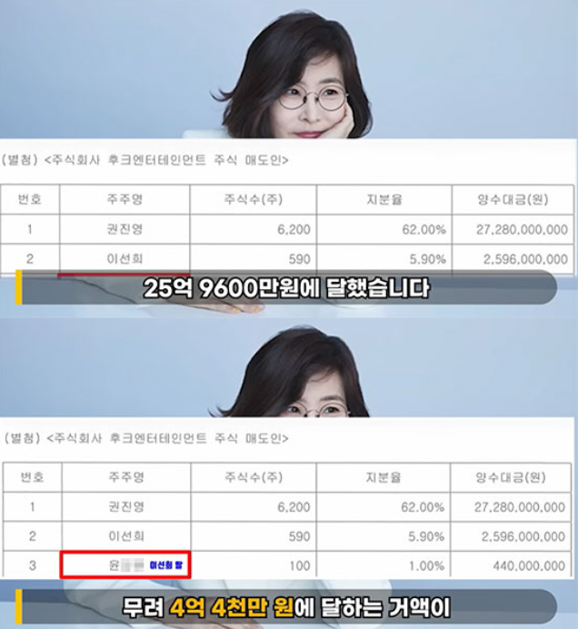 증여된 금액 중 이선희에게 증여된 금액은 25억 9600만 원이었으며, 이선희의 딸인 윤 씨에게도 4억 4천만 원이 증여된 것으로 발표되었습니다. 아무리 권대표가 어릴 적부터 봐온 조카 같은 이선희 딸이라고 해도, 후크엔터테인먼트에 기여한 인물이 아닌 이에게 증여를 한 것은 아무래도 논란이 될 수밖에 없을 것 같습니다.
