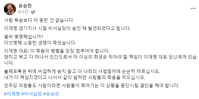 유승민 전 국민의힘 의원은 이재명대표의 경기도지사 전 비서실장이 숨진 채 발견되자, "이재명 대표. 이 죽음의 행렬을 당장 멈추어야 합니다. 벌써 몇 명째입니까. 다섯 명째 소중한 생명이 죽었습니다.'' 라며, 이 죽음의 책임을 이재명 대표에게 돌리고 있습니다.