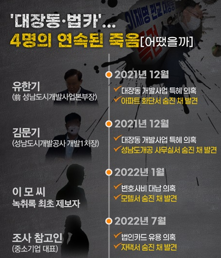 이로써, 이재명과 관련된 인물이 5번째 사망을 했으며, 사망자는 몇 명까지 불어날지도 관심이며, 이재명 더불어 민주당 대표는 이에 대해 어떤 입장을 취할 것인지도 관건입니다.