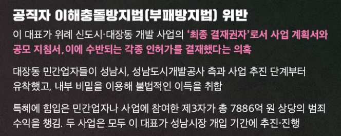 특혜에 힘입은 민간업자나 사업에 참여한 제 3자가 총 7889억 원 상당의 범죄 수익을 챙겼으며, 대장동 민간업자들이 성남시와 성남도시개발공사 측과 사업 추진 단 게부터 유착했으며, 내부 비밀을 이용하여 불법적인 이득을 취했다는 혐의를 받았으며, 이재명 대표는 위례 신도시와 대장동 개발 사업의 '최종 결재권자'로서, 사업 계획서와 공모 지침서 및 이에 수반되는 각종 인허가를 결제했다는 혐의입니다.