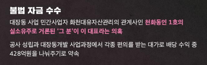 두번째로는 대장동 사업 민간사업자 화천대유자산관리의 관계사인 천화동인 1호의 실소유주로 거론된 그분이 바로 이재명대표라는 의혹이 있었으며, 공사 성립과 대장동 개발 사업 과정에서 각종 편의를 받는 대가로, 배당 수익 중 428억 원을 나눠주기로 약속받은 혐의입니다.