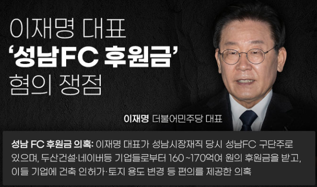 검찰은 수원지검 성남시청으로부터 이재명대표를 소환하여 '성남 FC 후원금 의혹'사건도 한 번에 묶어 구속영장을 청구했는데, 2014년 10월 성남시 소유 부지를 매각하는 대가로, 네이버로부터 성남 FC에 운영자금 50억 원을 공여하도록 요구한 혐의를 받았습니다.
