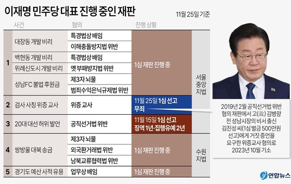 이재명 더불어민주당 대표는 2024년 11월 15일 위증교사 혐의 1심에서 무죄를 선고받았습니다. 그는 선고 직후, 진실과 정의를 되찾아준 재판부에 감사드린다고 전했으며, 공직선거법 위반 혐의 1심에서는 이재명대표에게 징역형 집행유예를 선고하였습니다.