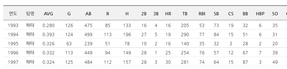 참고로, 이종범 선수의 해태 시절 기록을 보시죠. 1993년 KBO에 데뷔하여 일본에 진출전까지 5년간의 기록입니다. 신인시절 73개의 도루도 대단하지만, 2년 차였던 1994년도의 타율 0.393은 정말 깨지기 힘든 기록이고요. 도루 84개는 어떻게 설명을 해야 할지 모르겠네요. 그리고, 5년 차 때는 타율 3할에 홈런 30개를 기록하였습니다.