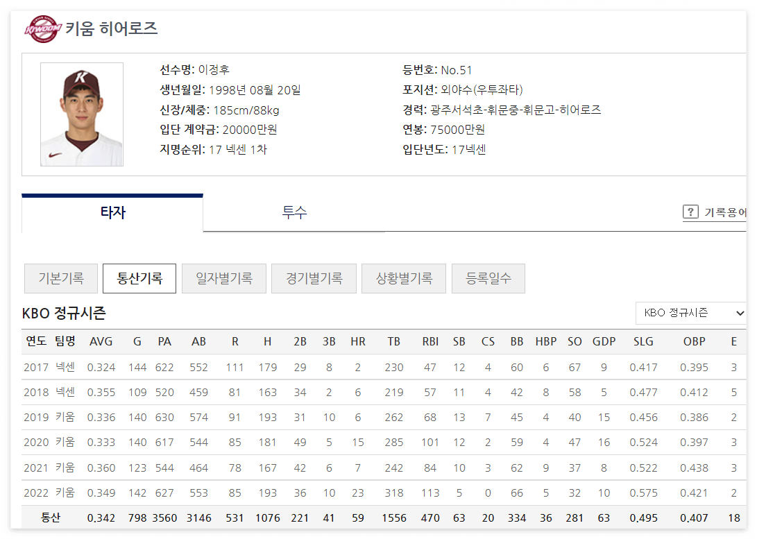 이로서, 이정후는 6년을 꽉 채우게 되었으며, 2023시즌 1년 후에는 메이저리그 진출을 눈앞에 두고 있습니다. 내년 시즌도 타율 3할, 홈런 20개, 타점 100개, 출루율 4할만 채우게 된다면, "메이저리그 총액 1억달러"는 받게 되지 않을까 하는 생각을 가져봅니다.