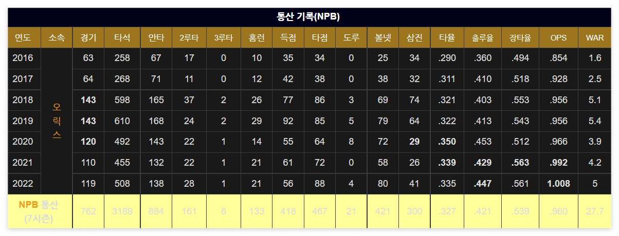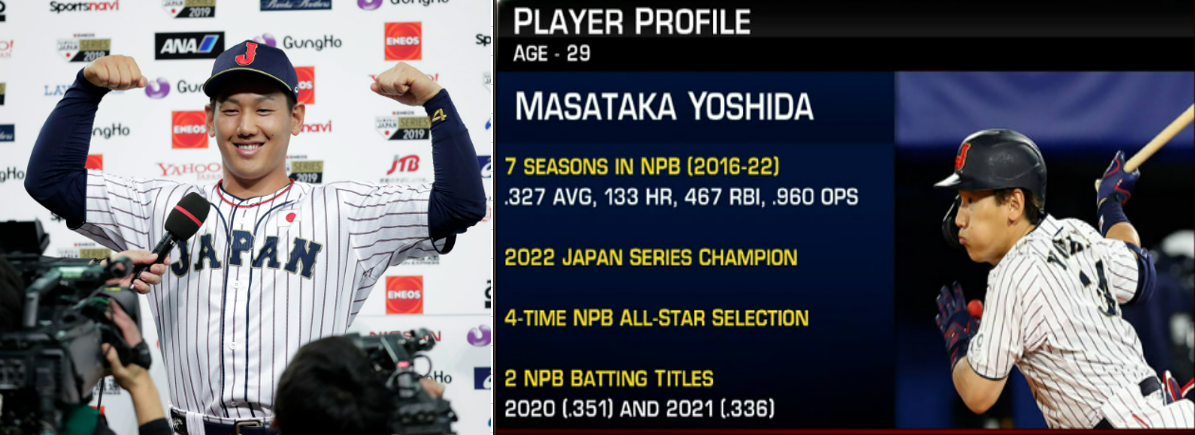 일본 최고의 교타자인 요시다 마사타카는 29살로, 오릭스에서 7년을 마친 후, 포스팅 시스템을 통해 보스턴 레드삭스와 5년간 총 9천만 달러의 계약을 맺었습니다. 추가로, 보스턴 레드삭스는 오릭스 구단에 포스팅 비용 1,537만 5천달러를 지불하는 등 요시다 영입에 총 1억 540만 달러를 지출하였습니다. 7년간의 프로생활동안 성적은 아래와 같습니다.