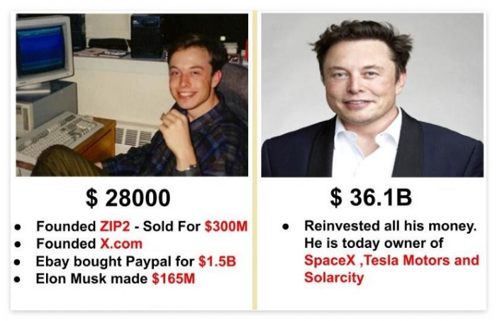 일론 머스크는 스탠퍼드 대학에서 물리학과 학생 2일 만에 학교를 그만두고 회사를 창업했습니다. Zip2라는 인터넷 회사를 창업하여 3억 달러에 매각을 하였으며, X.com과 페이팔의 합작회사를 이베이에 $1.5B에 판매하였으며, 그 후 스페이스 X를 설립하였으며, 또한 테슬라를 인수하며, 우주산업과 전기차 산업에 뛰어들었습니다.