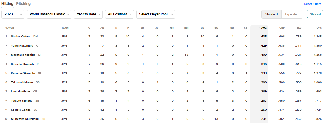 MVP를 받은 오타니 쇼헤이 뿐만 아니라 투수에서는 요시노부 야마모토가 7.1이닝 동안 삼진을 12개 뽑으면서, 방어율 2.45를 기록했으며, 사사키 선수도 7.2이닝 동안 삼진 11개를 뽑으면서 방어율 3.52를 기록했습니다. 사실 야마모토, 사사키, 오타니 등의 일본 투수들이 주목을 더 받았지만, 사실 일본 타자들이 훨씬 더 강력한 모습을 보였습니다.