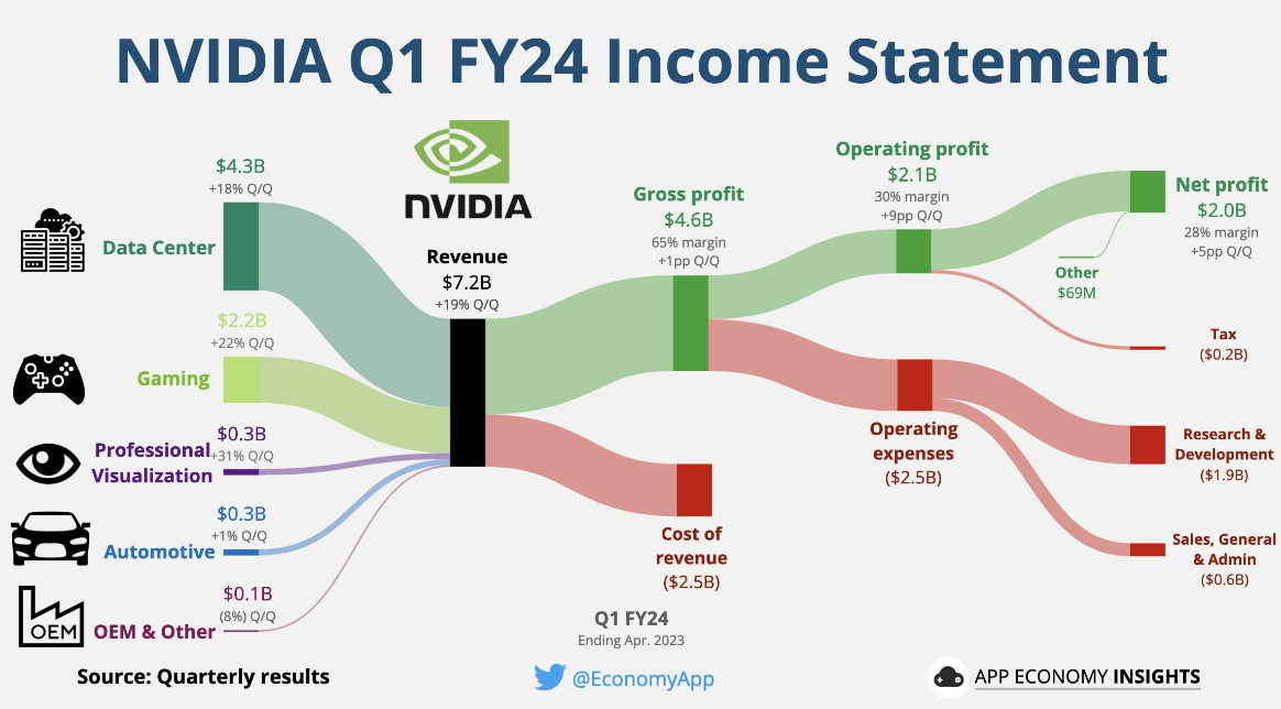 엔비디아의 1분기 매출은 71.9억 달러로, 약 $7.2를 나타내고 있으며, 1분기 매출의 $4.3B가 데이터 센터매출로 파악되었습니다. 엔비디아는 클라우드 공급업체와 대형 소비자 인터넷 회사에서 엔비디아 칩을 사용하여 OPEN AI의 chatGPT와 같은 생성형 AI 애플케이션을 훈련하고 배포하는 데 사용하는 GPU 칩에 대한 수요가 이번 엔비디아의 1분기 실적을 견인했다고 할 수 있습니다. 특히, 데이터센터 부분에서 엔비디아의 강력한 성능은 클라우드 제공업체와 대량의 서버를 운영하는 기업에서 AI칩의 중요성이 점점 더 커지고 있음을 보여주고 있습니다.