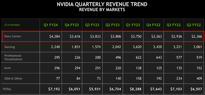 엔비디아의 GPU 그래픽처리장치는 AI학습의 필수 반도체로 여겨지고 있으며, 엔비디아는 전 세계 GPU 시장의 90% 이상을 차지하고 있으며, 엔비디아는 대형고객인 애플, 마이크로소프트, 구글, 테슬라, 아마존 등의 인터넷 기업과 클라우드 서비스 제공업체의 수요가 많으며, 이 고객사들은 생성형 AI 및 대규모 언어 모델 구동을 위해 엔비디아의 그래픽 칩을 탑재하고 있습니다. 엔비디아의 잰슨 황 CEO는 우리는 급증하는 데이터센터 칩 수요를 충족하기 위해 공급을 크게 늘리고 있다고 주장하였습니다.