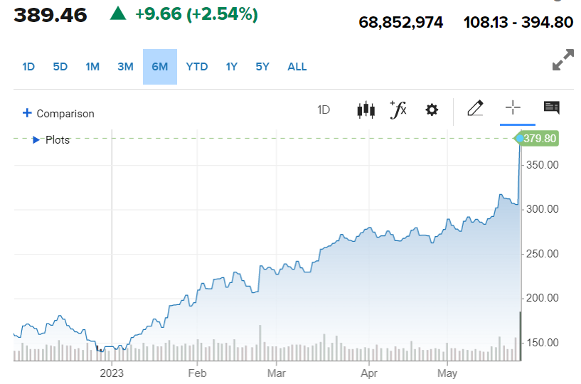 이에 따라, 엔비디아의 2분기 가이던스는 기존 71.5억 달러에서, 110억 달러로 크게 상향되었으며, 베어드는 엔비디아의 투자의견을 중립에서 시장수익률 상회로 상향 조정하였으며, 기존 목표주가도 300달러에서 475달러로 크게 상향조정하면서, 다른 기관들의 목표가도 상향될 것으로 예상됩니다. 엔비디아는 2023년 5월 27일 현재 주가가 389달러를 기록하였으며, 5월 초까지만 해도 275불이 넘지 않았었는데, 불과 한 달도 되지 않아 주가가 약 40% 이상 상승하였습니다.