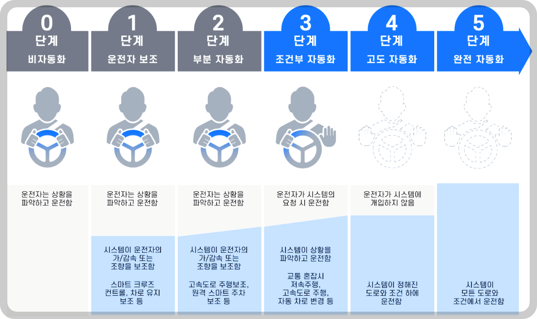 자율주행은 총 5단계로 나뉘며, 2022년도 현재 전기차들의 자율주행 레벨은 대부분 3단계 수준이며, 자율주행 기술분야에서 가장 앞서고 있는 테슬라의 자율주행 기술은 3단계에서 4단계로 넘어가는 수준에 있으나, 경쟁사들은 아직 3단계 초기 수준입니다. 그럼, 자율주행에 대해 단계별로 알아보겠습니다.
