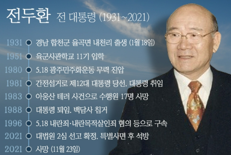 그 후, 베트남 전쟁에 파병되었다가 귀국 한 뒤, 1976년 차지절의 추천을 받고 대통령 경호실 작전차장으로 발탁되며, 실권을 장악하게 됩니다. 그 후, 박정희 저격 사건을 수사한 뒤, 1980년 비상계엄 전국확대 조치를 한 뒤, 5.18 광주 민주화 운동의 진압을 주도하게 되었습니다. 그 뒤, 8년 뒤인 대통령 퇴임 이후, 1995년에 내란죄 및 반란죄로 1심에서는 사형을 받았으나, 항소심에서 무기징역을 받았으며, 뇌물수수죄로 추징금 2200억을 선고받았으나, 1997년 김영삼 대통령시절 특별 사면조치를 받았으며, 추징금은 약 절반정도만 회수되었습니다.