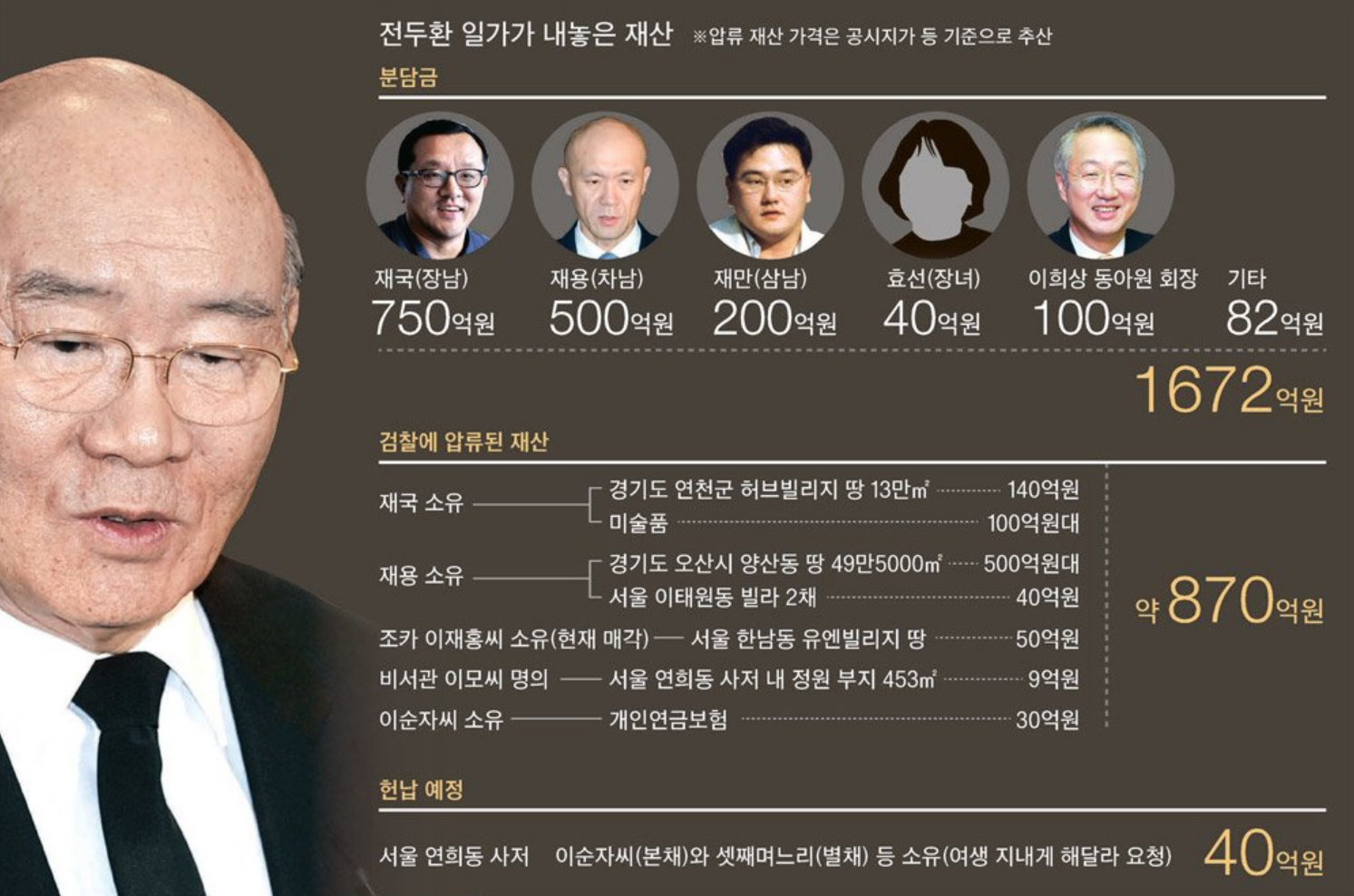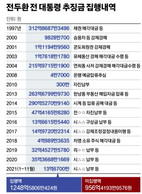 전두환 전 대통령의 추징금은 총 2205억이었으며, 그중 1248억 원인 약 57%만 집행한 상태이며, 검찰은 전두환 사망에도 불구하고, 은닉재산을 찾는 등 끝까지 환수할 수 방법이 없는지 검토하겠다는 입장을 밝혔습니다.