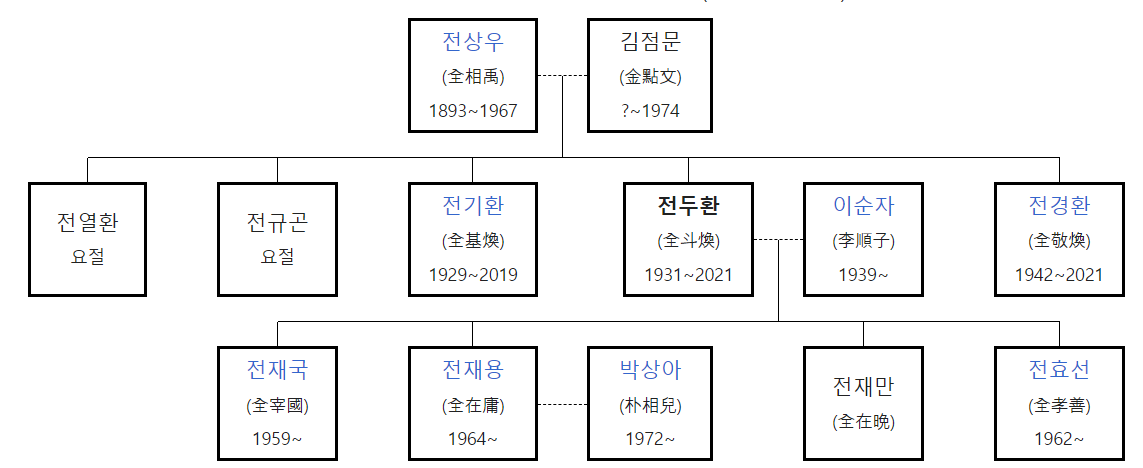 전두환 재임시절 형인 전기환이 노량진 수산시장을 인수하고, 동생 전경환이 새마을운동 중앙본부 회장을 지내며 비리를 저질러 퇴임하는 등의 물의를 일으켰으며, 첫째 아들 전재국은 출판업체 시공사의 대표이며, 둘째 전재용은 탤런트 박상아 씨와 결혼했으며, 셋째인 전재만은 한국제분 사장이자 운산그룹 회장 이희상의 장녀와 결혼했습니다. 또한, 장녀인 전효선 씨는 서경대학교 교양영어 조교수로 있습니다. 하지만, 현재는 전두환이 남기고 간 비자금은 이순자 여사가 모든 것을 관리하고 있다고 알려져 있습니다.