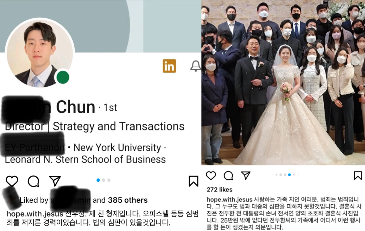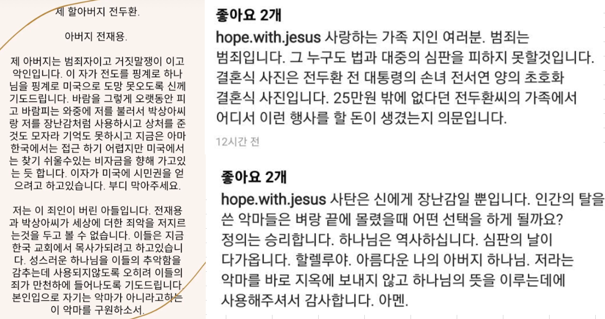 전두환의 손자이며, 전재용과 박상아가 부모인 둘째 아들 '전재용'씨가 2023년 3월 14일 본인의 인스타그램에 자신의 가족의 범죄를 폭로하였습니다. 그는 현재 만 27세이며, 뉴욕주립대학을 졸업한 뒤, 뉴욕 한영회계법인 파르테논 전략컨설팅 부서에서 일을 하고 있으며, 현재 목사가 되기 위해 백석대학에서 신학대학원에 재학 중이라고 소개하면서, 본인의 할어버지인 고전두환 전 대통령뿐만 아니라, 할머니 이순자 여사와 아버지와 친척들에 대한 행각까지 자세히 폭로하고 있어서 파장이 커질 것으로 예상됩니다.