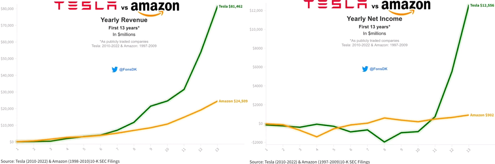 테슬라와 아마존의 첫 13년간의 매출액 및 순이익을 살펴보겠습니다.