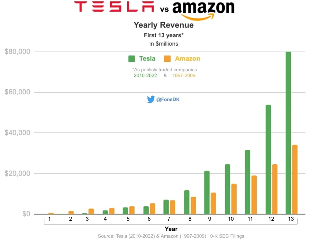테슬라와 아마존의 창립 이후, 첫 13년의 매출을 표로 나타낸 것이며, 테슬라(녹색)가 7년 차에 아마존을 넘기 시작하더니, 13년 차에는 2배 이상 차이가 나는 것을 알 수 있습니다.