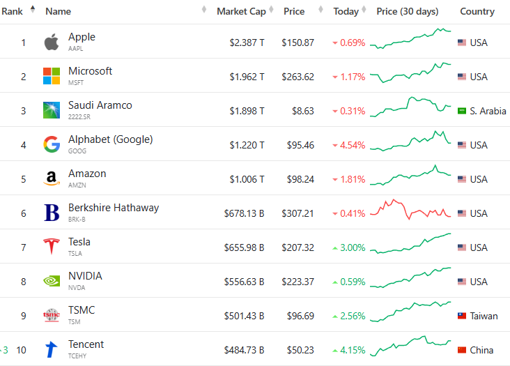 애플의 시총은 2조 3870억 달러(약 3,000조 원)로, 전 세계 1위의 시총을 자랑하고 있으며, 1천억 달러가 넘는 회사는 마이크로소프트, 아람코, 알파벳과 아마존입니다. 그 뒤로, 버크셔해서웨이와 테슬라 엔비디아 순으로 이어지며, 아시아에서 가장 큰 시총은 TSMC와 텐센트로서 9위와 10위를 기록하고 있습니다.