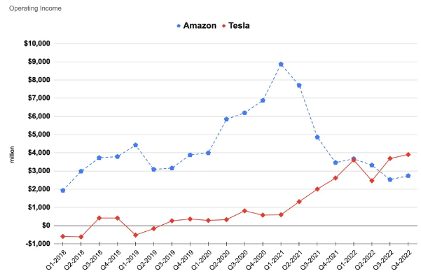 보통 시총은 회사가 벌어드리는 수익과 굉장히 비례하는 것으로 알려져 있습니다. 이에 따라, 1천억 원의 시총을 자랑하는 아마존 시총이 5위이며, 테슬라는 불과 650억 달러의 시총을 기록하며, 7위에 랭크되어 있습니다. 위 표를 보시면 아마존과 테슬라의 영업이익을 비교한 표입니다. 최근에 발표한 2022년도 4분기 영업이익을 보시기 바랍니다.