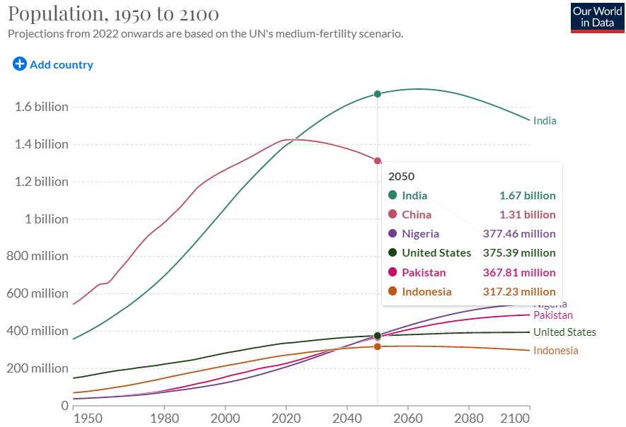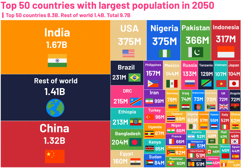 2050년도 전 세계 인구는 97억 명으로 2022년에 비해 약 20% 상승할 것으로 예상되며, 인도는 전 세계에서 가장 인구수가 많은 국가로 약 16억 7천만 명을 기록할 것으로 예상되며, 중국은 오히려 인구수가 약 1억 명 줄어든 13억 2천만 명으로 예상되고 있습니다.
