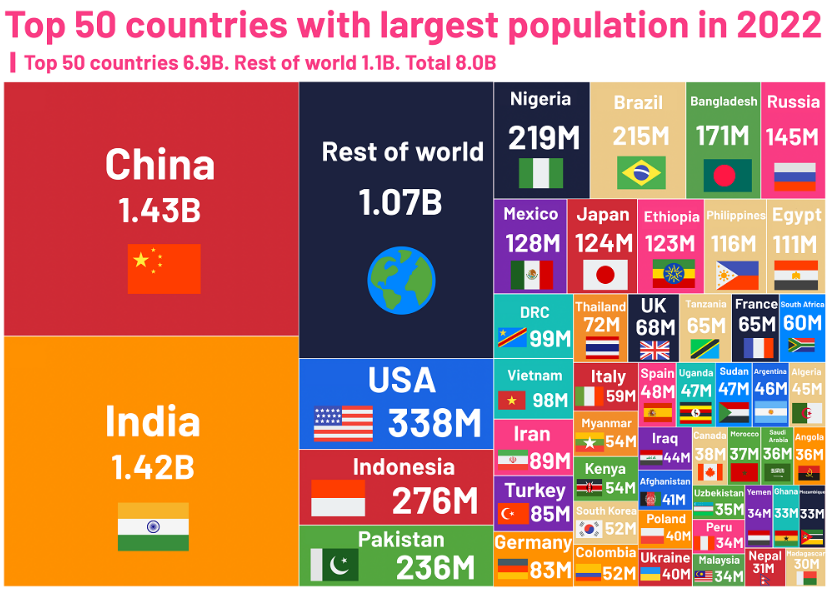전 세계 80억명의 인구중에 1위와 2위는 중국과 인도이며, 이 두 국가의 인구수 차이는 단지 1천만명밖에 나지 않으며, 3위는 미국으로 약 3억 4천만명입니다. 1,2위와 3위와의 격차는 어마어마하며, 아시아 국가들의 인구수가 엄청난 것을 알 수 있습니다. 한국도 나라의 규모에 비해서는 많은 인구수를 보이며, 5천2백만명을 기록하고 있습니다.