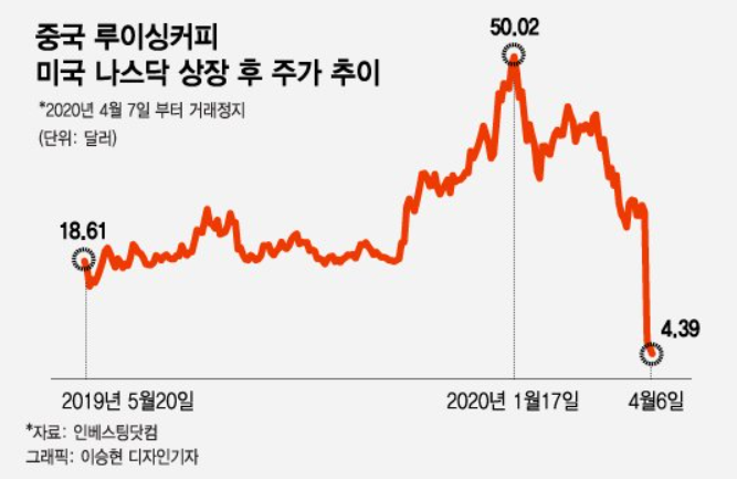 2020년 나스닥 상장 1년 후에 터진 루이싱커피의 분식회계 사태로 인해, 나스닥에서 퇴출당하게 되었는데요. 가입자수의 60%를 뻥튀기하는 등 매출을 최소 50% 부풀렸다는 사실이 폭로되면서, 루이싱커피는 고점대비 주가가 75%나 주식이 떨어지면서, 모든 주식이 스탑되게 됩니다. 루이싱커피의 분식회계사태로, 모든 중국 기업들에 대한 회계감사가 들어갔으며, 수많은 중국 기업들의 회계부정을 의심받고 있습니다.