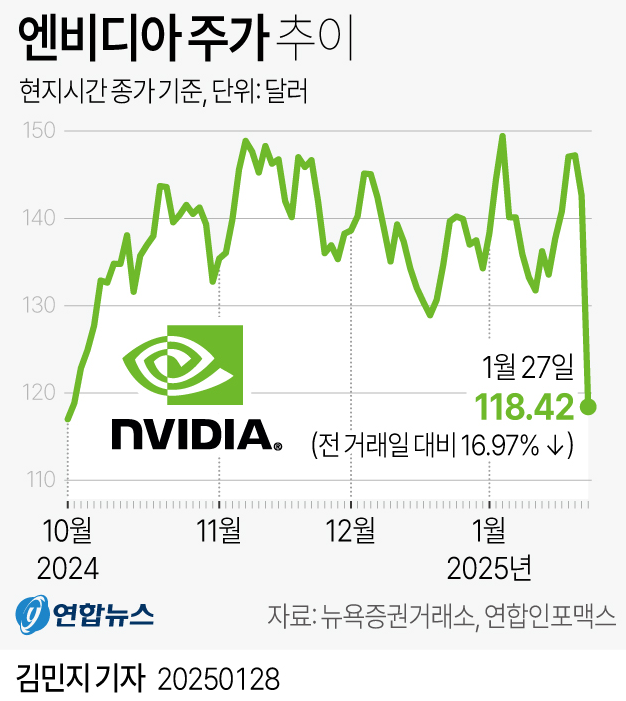 딥시크의 등장으로 인해, 엔비디아 주가는 약 -17프로나 폭락을 하며, 나스닥에 커다란 충격을 주었으며, 이를 회복하려면 상당한 시간이 필요할 것으로 예상되고 있습니다.