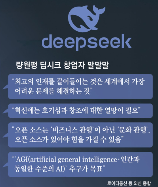 또한, 딥시크의 연구개발 인력은 불과 139명이며, 딥시크 창업 후 전 직원이 150명뿐이나, 마이크로소프트는 약 7000명, 구글은 약 5000명의 연구개발 인력을 보유하고 있는 것으로 알려졌습니다.