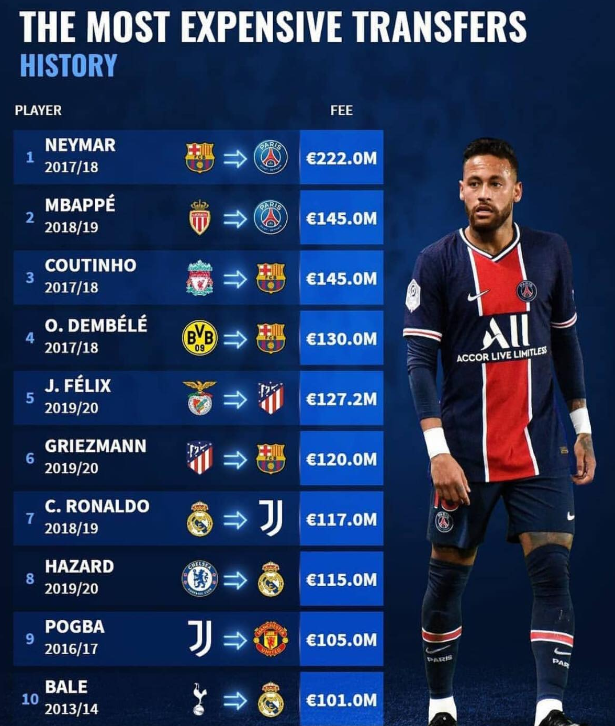 1위는 브라질 대표선수인 네이마르로 2017~2018 시즌 바르셀로나에서 PSG로 이적하며 엔초 페르난데스가 기록한 역대 6위의 이적료의 거의 2배를 챙기는 역대 1위를 기록하였습니다. 아직 만 29살로 젊은 나이이기는 하나, 2022 카타르 월드컵 이후 좀 침체된 모습을 보여주고 있습니다.