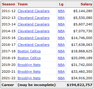 현재 약 35백만 달러(약 430억 원)의 연봉을 받고 있으며, nba 생활동안 총 약 2억 달러(약 2500억 원)의 연봉을 받은 카이리 어빙은 워낙 슛 정확도가 좋은 가드로서, 그의 화려한 드리블 실력 또한 참 매력적인 선수입니다. 사실 펩시 광고였던 엉클 드류 시리즈의 주인공으로서, 영화까지 개봉을 하였으며 그 인기 그대로 nba에서 정상적으로 활약을 했으면 어땠을까 하는 생각을 해볼 정도로, 실력에 비해 그의 괴기한 행보는 참 아쉽습니다.