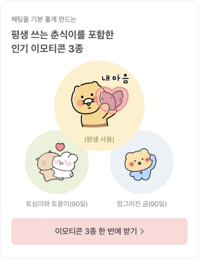 카카오가 지난 2022년 10월 발생한 데이터센터 화재 보상으로 카카오톡 무료 이모티콘 3종세트로 향후 안정적인 서비스를 제공하겠다는 카카오의 약속과 사과의 의미를 담았습니다.