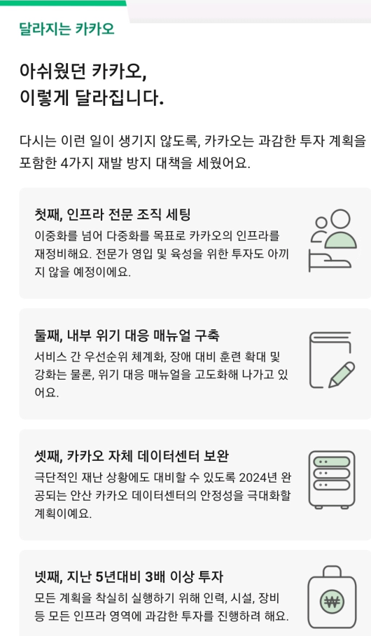 카카오가 다시는 재발하지 않도록 4가지의 핵심 전략을 발표했습니다. 전문가 영입 및 육성을 위해 투자를 아끼지 않을 계획이며, 위기대응 매뉴얼 고도화와 자체 데이터센터 구축과 더불어 인프라 시설에 투자를 확대한다고 하니, 2023년부터 확 달라진 카카오를 기대하겠습니다.