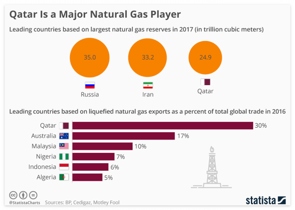 카타르는 면적은 작지만, 세계에서 3번째로 천연가스가 많이 매장되어 있는 국가입니다. 천연가스 수입으로 먹고사는 나라이지만, 원유도 나오는 나라입니다. 원유의 매장량은 세계 13위로 랭킹은 낮은 편이지만, 중동이라는 국가답게 GDP의 80%가 가스와 오일로부터 생성되고 있습니다. 더더구나 최근 러시아-우크라이나 전쟁으로 인해 유럽 국가들이 러시아로부터의 가스 수입을 단절하고 있는데, 이 혜택을 카타르가 대부분 받고 있습니다.카타르는 유럽과의 거리도 멀지 않다 보니 물류와 유통비가 매우 저렴하므로, 유럽 대부분의 국가들이 비싼 미국의 천연가스보다는 카타르에서의 가스 수입을 선호하고 있습니다.
