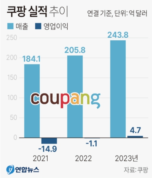쿠팡은 최근 10년간 누적적자액이 약 6조 원에 이르렀을 정도로, 만년 적자 기업이라는 꼬리표를 받고 있었으나, 이제는 당당히 영업이익 흑자로 돌아섰으며, 2024년에는 멤버십 인상을 통해, 약 10억 달러(약 1.3조 원)의 영업이익을 달성할 수 있을 것이라 전망되고 있습니다.