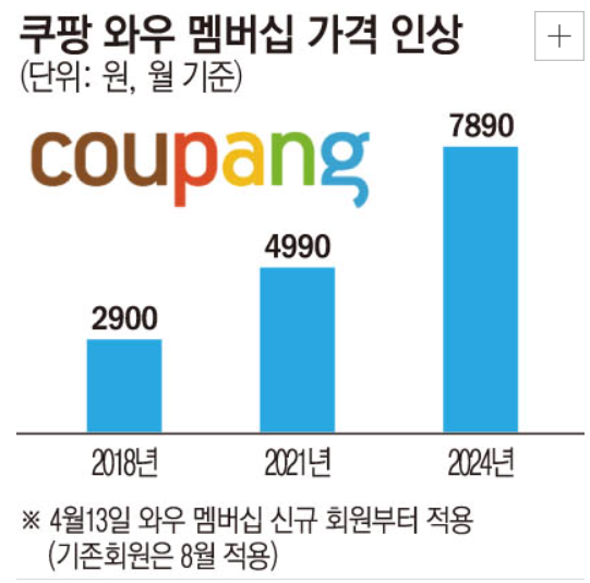 대한민국 최대 전자상거래 기업인 쿠팡이 와우 멤버십 요금을 58% 인상하면서, 기존 월 이용료를 4,990원에서 월 7,890원으로 인상한다고 발표했습니다. 따라서, 신규회원은 바로 월 7,890원의 요금이 적용되며, 기존 이용자들은 올해 8월부터 인상된 요금이 적용된다고 밝혔습니다.