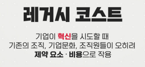 "레거시 코스트"란 어떤 혁신을 하려 할 때, 이미 갖고 있는 조직이나 기업 문화, 조직 내의 사람들이 도움을 주는 것이 아니라, 오히려 제약 요소가 되며, 거대한 비용으로 작용하는 것을 의미합니다.