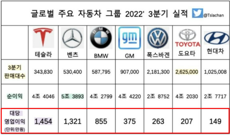 전에 말씀드린 2022년도 3분기 주요 글로벌 자동차 회사들의 판매대수 및 순이익 그리고 대당 영업이익을 나타낸 표입니다. 벤츠와 BMW와 같은 럭셔리 자동차 회사들만 테슬라와 비교할 수 있으며, 나머지 자동차 레거시 기업들은 처참한 수준을 보이고 있습니다.