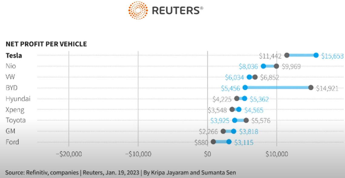 2023년 1월 20일 로이터 통신에서 아주 재미있는 소식을 전했습니다. 그것은 바로 전치차 회사인 테슬라가 판매하는 대당 총이익과 순이익이 다른 경쟁차 회사에 비해 압도적으로 높다는 뉴스가 전해졌습니다.