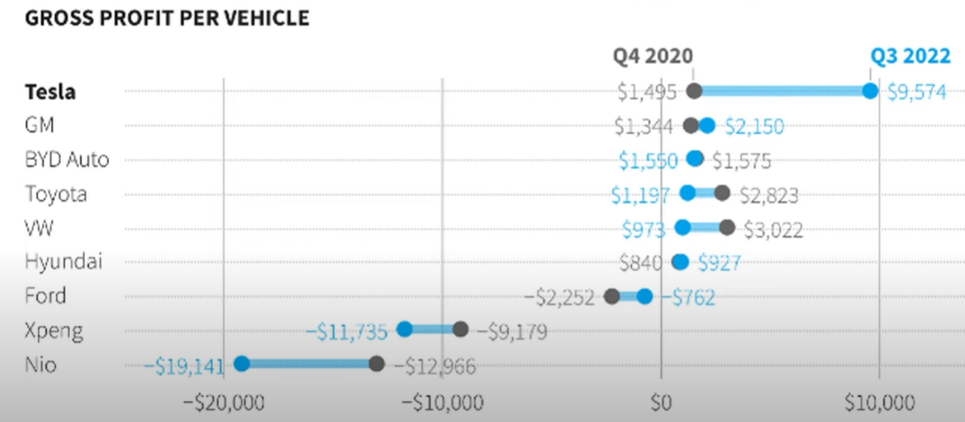 아래 보이는 표는 로이터 통신에서 만든 주요 자동차 회사들의 대당 매출 총이익을 나타낸 표입니다. 그리고, 검은색 점은 2020년 4분기, 파란색 점은 2022년도 3분기를 뜻합니다.