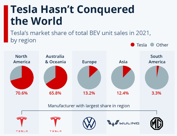 또한, 2021년 말 기준 테슬라는 북미의 시장점유율은 70%가 넘으며, 오세아니아는 65%의 시장점유율을 보이고 있지만, 아직 부유하지 못한 남미에는 아직 테슬라 차량의 시장점유율이 3.3%밖에 차지하지 못하고 있습니다.