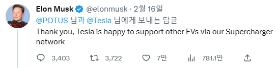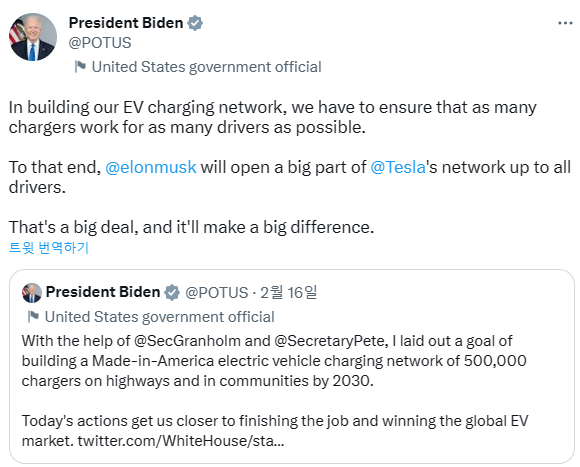 바이든 미국 대통령은 테슬라와 일론머스크에게 감사의 뜻을 전하며, 테슬라의 슈퍼차저는 전기차 충전 네트워크 구축에 많은 도움이 될 것이라며, 2030년까지 50만개의 충전소를 지을 것이라고 밝혔습니다. 이에 대한 답글로 일론머스크는 감사하다며, 테슬라는 향후 전기차 슈퍼차저 네트워크를 경쟁사들에게 지원할 것이라고 밝혔습니다.