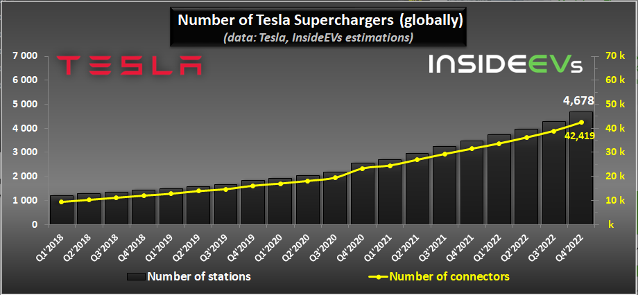 2012년 9월 첫번째 테슬라 슈퍼차저가 론칭한 이래, 2018년 6월 슈퍼차저 10,000대를 돌파했으며, 2022년 11월에는 4만 대를 돌파하여, 2022년 말에는 42,419대의 슈퍼차저가 설치가 되었습니다. 이번에 테슬라가 경쟁사에게 테슬라 슈퍼차저를 공개하기로 결정하면서, 2023년 말에는 지금의 슈퍼차저 수량을 2배로 늘린다고 발표하였기 때문에, 올해 말이면 테슬라 슈퍼차저의 개수는 약 8만 대까지 증가할 것 같습니다.