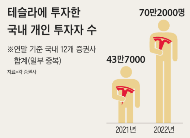 2022년 연말기준 12개 증권사의 합계를 보면, 대한민국에서의 테슬라 주주들은 약 70만 명이라 합니다. 그만큼 테슬라에 대한 펀더멘털을 포함하여, 전기차, 배터리, 충전소, 로보택시, 메가팩 등을 포함하여 FSD까지 테슬라의 향후 엄청난 성장성을 보고 투자한 서학개미들이 엄청나게 많다는 뜻이 되겠습니다.