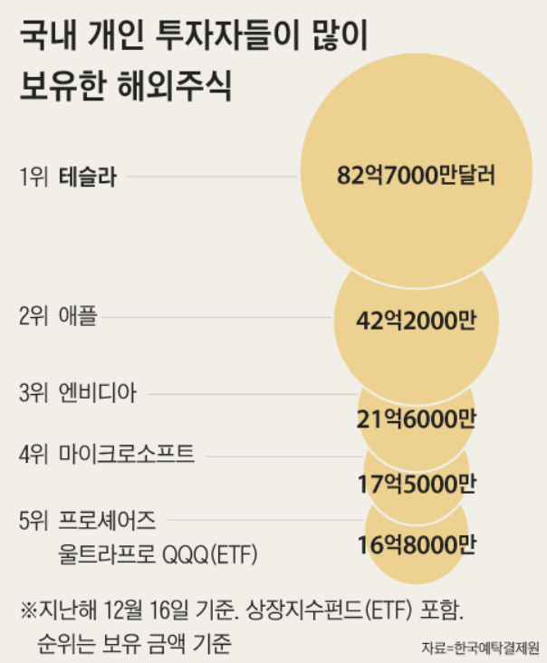 테슬라는 서학개미들이 가장 많이 보유한 해외 주식 1위에 뽑혔으며, 주식평가액이 2위를 차지한 애플의 2배였으며, 3위를 차지한 엔비디아의 4배로 압도적 1위를 기록했으며, 평가금액도 약 11조 원에 이르는 것으로 밝혀졌습니다.