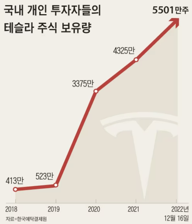 테슬라는 수년 전부터 서학개미들의 매수 순위 1위에 오른 주식이었으나, 작년 주식 하락기에 테스라에 투자한 서학개미들이 급증한 것으로 기록되었습니다.