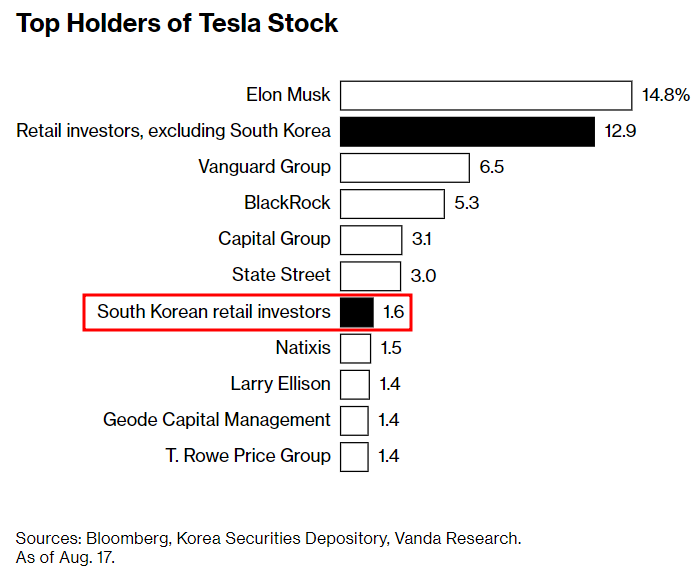 한국서학개미들이 보유한 테슬라 주식은 약 5500만 주, 한화 약 11조 원으로서, 테슬라 주주구성 중 6위에 해당할 정도로, 대한민국에서 테슬라를 사랑하는 테슬람들이 참 많은 것으로 드러났습니다. 테슬라의 CEO인 일론 머스크가 1위이며, 나머지 2위부터 5위까지는 글로벌 자산운용사들이 주요 주주인 것으로 확인되었습니다.