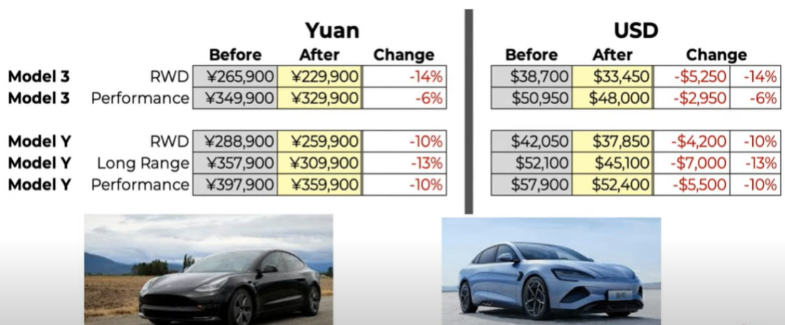 테슬라의 모델3와 모델 Y가 중국에서 가격을 약 10% 이상 할인하며, 중국에서의 반전을 모색하고 있습니다. 2022년까지 BYD는 테슬라보다 약 1만 달러 이상 가격이 저렴하여, 중국에서 테슬라와의 가격경쟁력을 앞세우며, 판매량이 급증했었죠. 이에, 중국인들도 비슷한 차량이라면 중국기업인 대중차인 BYD를 구매하는 경우가 많았습니다. 하지만 테슬라가 모델3 RWD의 가격을 14%나 낮추면서, BYD Seal의 가격이 212,800위안(약$30,965)이기 때문에, 이 두 차량은 불과 $2,500 밖에 차이가 나지 않는 모습을 보이고 있습니다. $2,500는 약 300만 원이기 때문에 세계 최고의 전기차 브랜드인 테슬라를 구입할 수 있다는 생각을 하고 있을지도 모르겠네요. 이로써, 보통 중국의 부자들만이 구매를 하고 있는 테슬라를 중국의 많은 서민들도 이젠 구매를 할 수 있는 가격대까지 떨어지고 말았습니다.